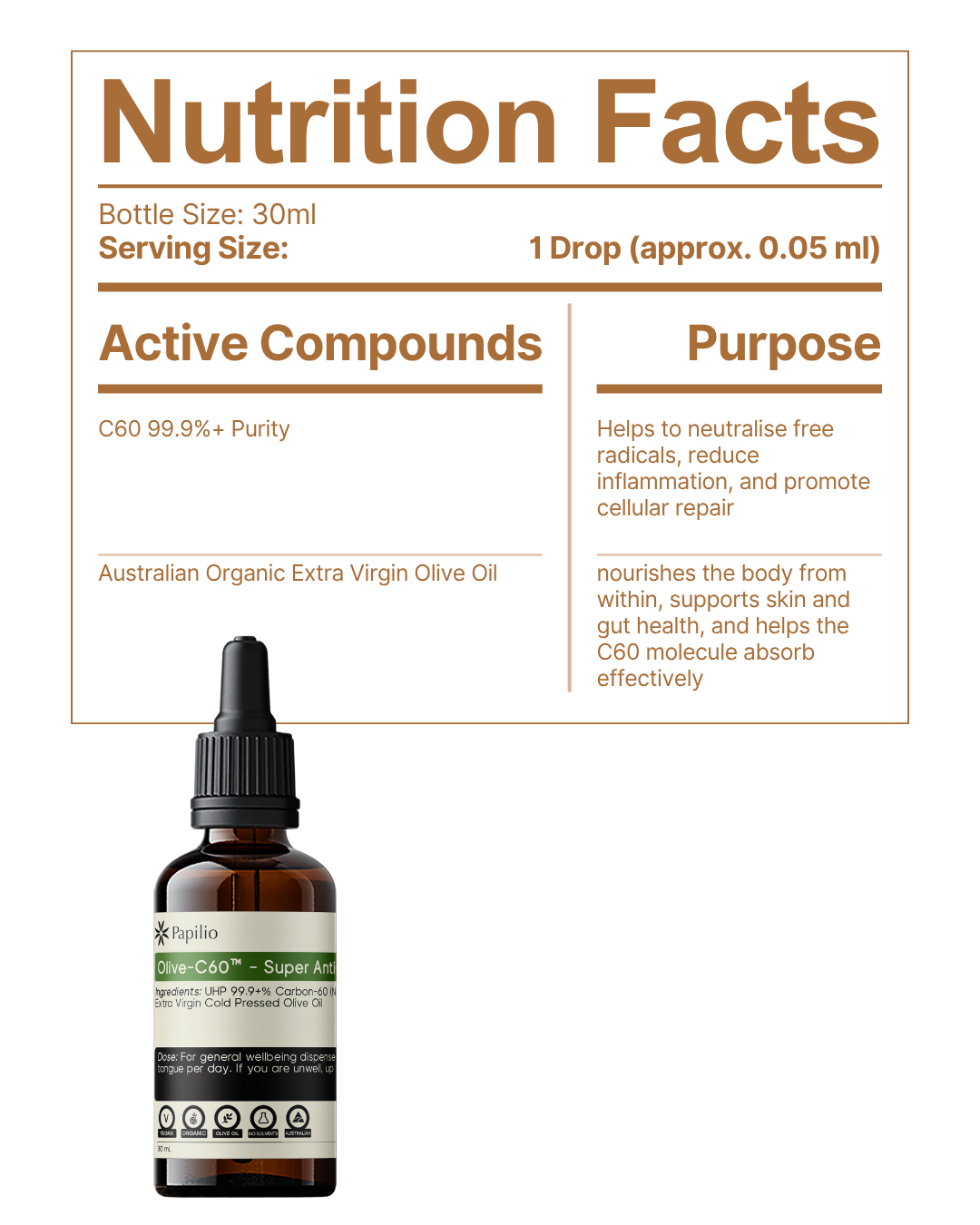 Olive-C60™ is a highly concentrated, solvent-free Carbon 60 antioxidant oil designed to neutralise free radicals and support cellular health from the inside out. Nobel Prize–winning molecule known as the strongest antioxidant ever discovered. Ours is bio-pharma grade, 99.9+% pure, and solvent-free, helping to neutralise free radicals, reduce inflammation, and promote cellular repair. Sourced and blended with absolute integrity.